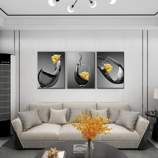 Kitchen Wall Decor Wine Glass Wall Art Easy to Hang High Definition Canvas Yellow Wine Art Pictures with Inner Wood Frame for Living Room Office Dining Room 12X16Inch X3Pcs…