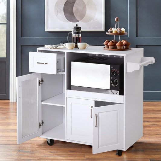 Microwave Stand Cart with Wheels - White Kitchen Island with Microwave Shelf, Rolling Kitchen Cart with Storage