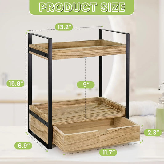 2-Tier Bathroom Organizer Countertop with Drawer, Wood Counter Shelf for Bathroom Storage, Vanity Tray for Bathroom Organization and Decor, Countertop Organizer for Bathroom, Kitchen, Office (Brown)
